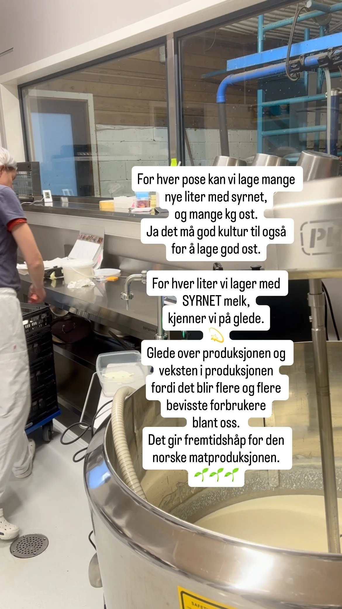 Vegg i vegg med melkestallen er vårt gårdsmeieri. Melka går rett fra melkestallen og inn i kjelen i meieriet. Gårdsmeieriet ble ferdigstilt våren 2025, etter 4 år med produksjon i en mobil meierivogn.